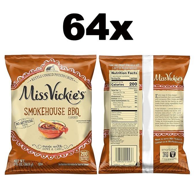 Miss Vickie's Kettle Cooked Potato Chips, Smokehouse BBQ Flavored , 1.375 Ounce (Pack of 64)