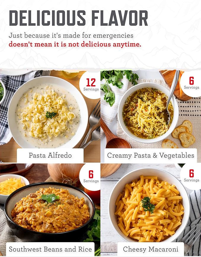 - NUTRITIOUS MEALS: Our emergency supplies offer convenience and tasty, nutrient rich options, including Cheesy Macaroni, Lasagna, Teriyaki Rice, and Chicken Flavored Noodle Soup! Perfect for travel necessities, as well as home and kitchen use.