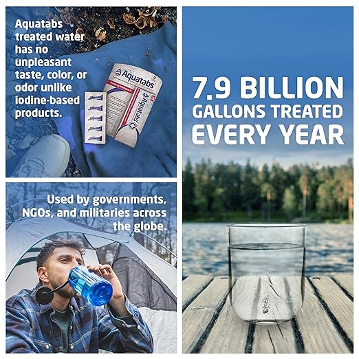 - ENJOY GREAT TASTING WATER EVERY TIME - Aquatabs-treated water has no unpleasant taste, color, or odor unlike iodine-based products. Pair Aquatabs water purifying tablets with a water filtration system to treat water from sediment heavy sources.