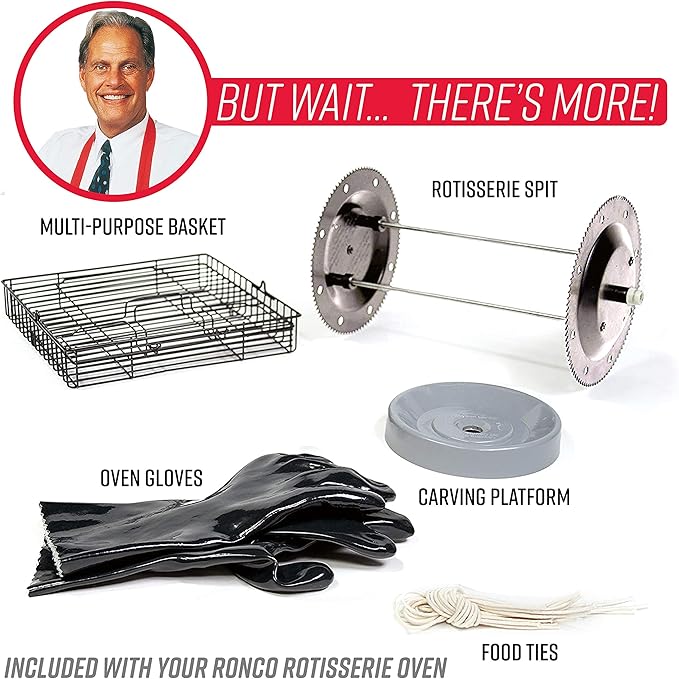 - MODERN EDITION INCLUDES: Ronco Modern Edition Rotisserie Oven with silicone door tie, multi-purpose basket, rotisserie spit, carving platform, removable drip tray, oven gloves, food ties