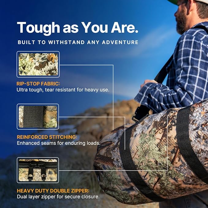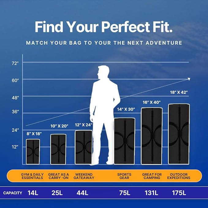 - COMPACT YET SPACIOUS: Measuring 18" x 42", 175 Liter, this big travel bag is compact yet spacious enough for your essentials. Whether you need a gym bag, outdoor Weatherproof duffel bag for men or a camping bag, its large capacity ensures easy transport without compromising storage.