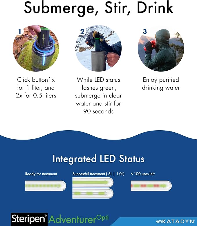 - EASILY PURIFY 1L OF WATER IN 90s: Hand-held device with simple one-button activation and intuitive operation. Simply place in water within a wide-mouth bottle or container, stir, and wait for the UV lamp to indicate when purification is complete.
