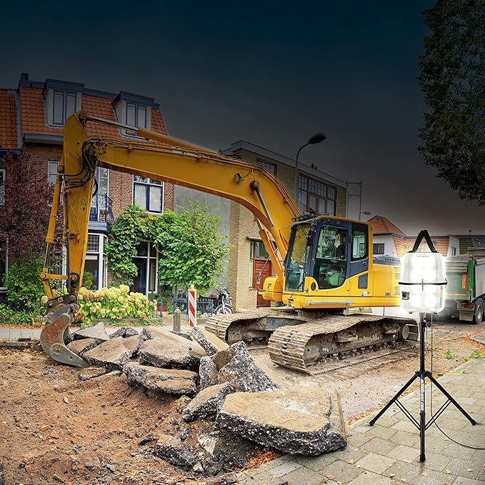 Portable LED Work Light 20,000 Lumens, Professional Lighting Dispersed in 360 Degrees, Weather Resistant Durable Indoor Outdoor Use with Telescoping Tripod Stand