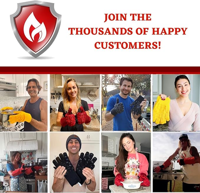 - Extreme Heat Resistant & Cut Resistant - EN407 certified, that can withstand heats up to 932°F. Our heat resistant gloves provide the highest protection for your hands, so you can cook with confidence with flexible fire gloves in extreme heat. The gloves also provide the highest EN388 level 5 cut resistance which is 4 times stronger than leather. Ideal for cutting vegetables, meats, fish and more.