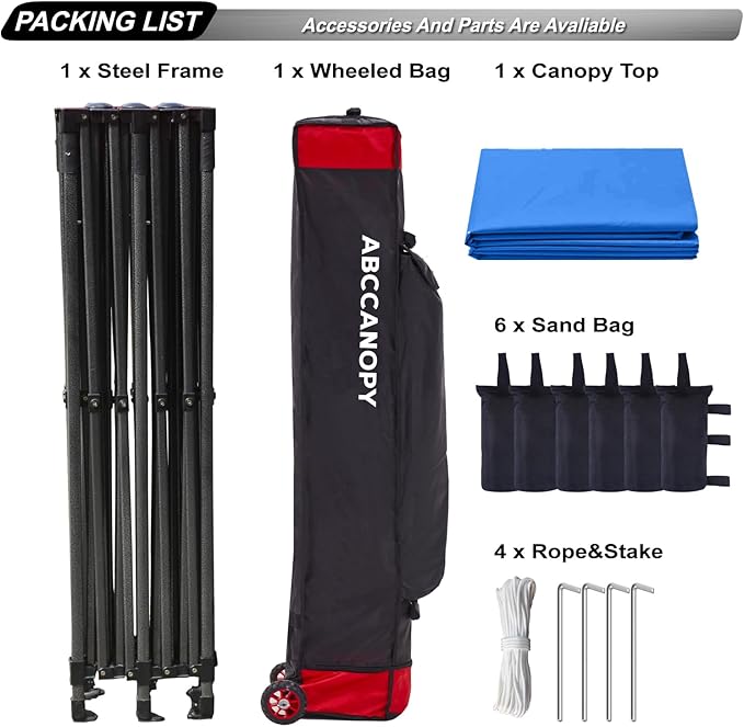 - Set up in second: Super easy to set up with only 2 people. Roller bag for easy portability and light transportation. Heavy duty wheels glide smooth. Bonus 6 Canopy Sand Bags, 4 Stakes &Ropes for stable and sturdy use.
