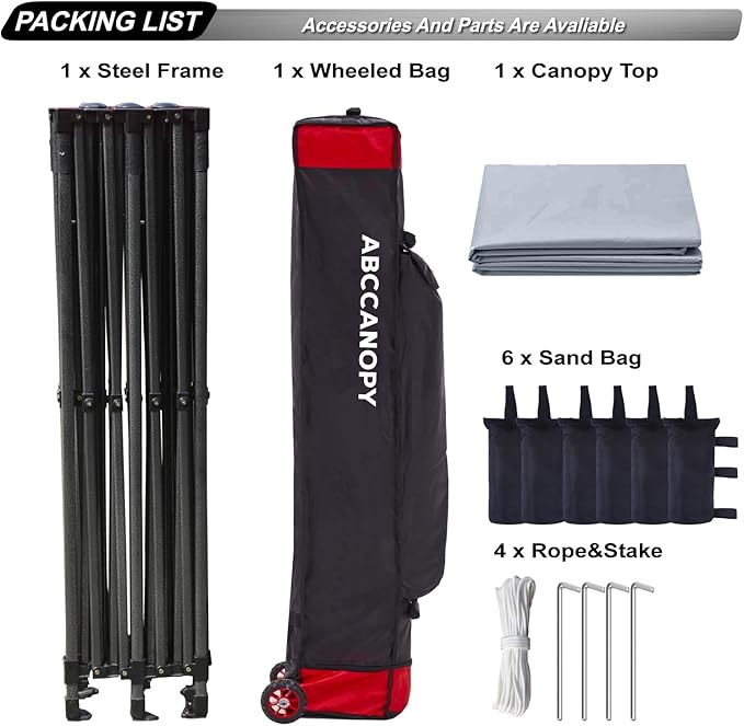 - Set up in second: Super easy to set up with only 2 people. Roller bag for easy portability and light transportation. Heavy duty wheels glide smooth. Bonus 6 Canopy Sand Bags, 4 Stakes &Ropes for stable and sturdy use.