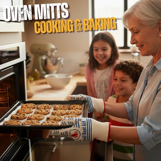 - ๐ฅ EXTREME HEAT RESISTANT GLOVES: Premium kitchen mitts for oven EN407 certified, withstanding heat up to 1472ยฐF. Crafted from 100% Aramid flame retardant fabric aka Kevlar Gloves, oven mitts heat resistant gloves handle hot cookware and flames.
