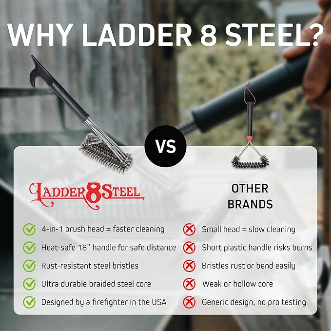- ๐๐ฎ๐ซ๐๐๐ฅ๐ ๐๐ง๐ ๐๐๐ฅ๐ข๐๐๐ฅ๐ ๐๐๐ ๐๐ซ๐ข๐ฅ๐ฅ ๐๐ซ๐ฎ๐ฌ๐ก ๐๐จ๐ซ ๐๐ง๐๐ฅ๐๐ฌ๐ฌ ๐๐๐ ๐ ๐ฎ๐ง: Our firefighter-tested grill scrubber is crafted to last, offering durability you can count on. This BBQ grill brush and scraper, along with our top-quality grill cleaning brushes, are the ultimate BBQ cleaning tools for outdoor grills. Designed for effortless maintenance, this grilling brush is built for countless BBQs, keeping your grill spotless season after season. We offer a 100% satisfaction guarantee, so you can cook up more delicious meals without worry!