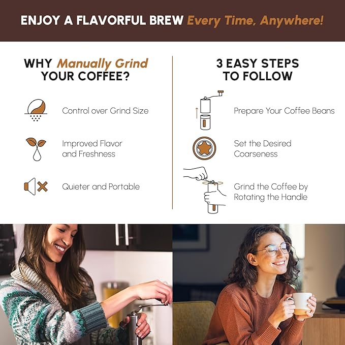 - CONVENIENT, PORTABLE, AND EASY-TO-USE ESPRESSO GRINDER ― The hand crank grinder eliminates 90% of electric grinder noise. JavaPresse's patented manual ceramic burr assembly needs no batteries or cords, making it perfect for fresh coffee at home or on the go. It's the ultimate camping coffee grinder and pairs perfectly with your coffee maker, offering a noise-free grinding experience.