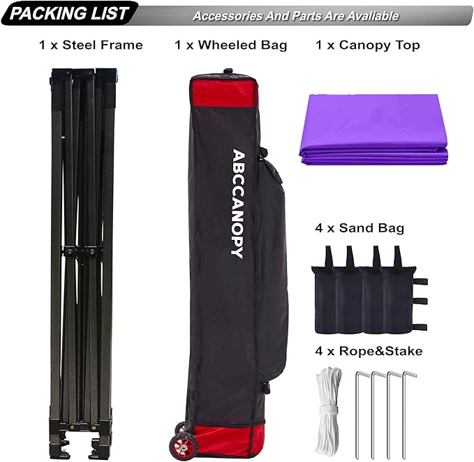 - Set up in second: Super easy to set up with only 2 people. Roller bag for easy portability and light transportation. Heavy duty wheels glide smooth. Bonus 4 Canopy Sand Bags, 4 Stakes &Ropes for stable and sturdy use.