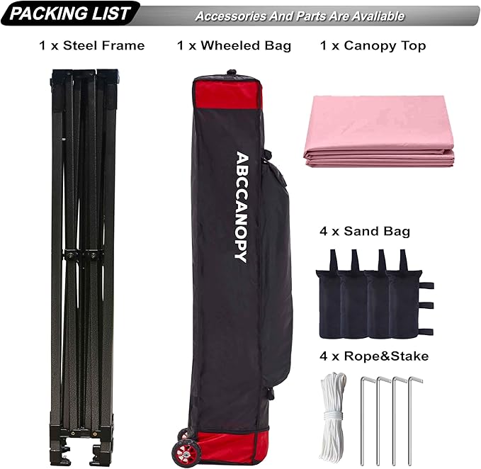 - Set up in second: Super easy to set up with only 2 people. Roller bag for easy portability and light transportation. Heavy duty wheels glide smooth. Bonus 4 Canopy Sand Bags, 4 Stakes&Ropes for stable and sturdy use.