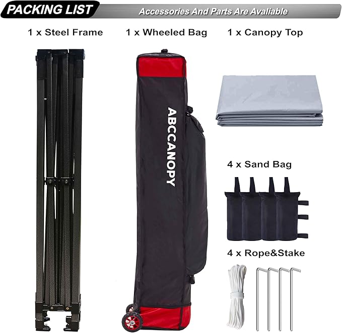 - Set up in second: Super easy to set up with only 2 people. Roller bag for easy portability and light transportation. Heavy duty wheels glide smooth. Bonus 4 Canopy Sand Bags, 4 Stakes &Ropes for stable and sturdy use.
