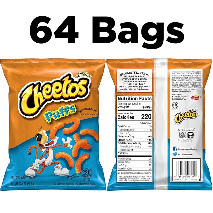 - 64 Count of 1.375 oz. bags of CHEETOS Puffs Cheese Flavored Snacks