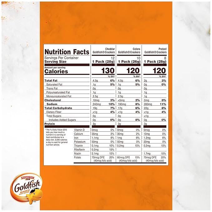 - Variety pack includes: 10 single-serving packs of Goldfish colors, 12 packs of Goldfish cheddar, 8 packs of Goldfish pretzels