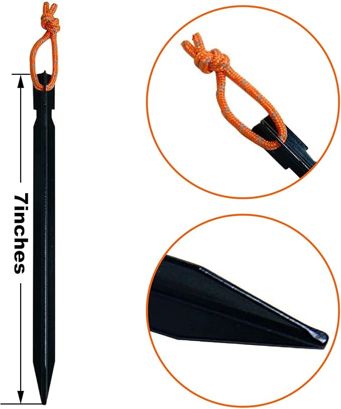 - Suitable Size: Camping stakes are used to help maintain the tent's shape, and to hold the tent in place against wind. Our 7 inches long metal stakes camping tent accessories - Enough to make your tent firmly grasp the length of the ground
