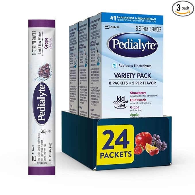 Pedialyte Electrolyte Powder, Hydration Drink for Kids & Adults, Variety Pack: Strawberry, Fruit Punch, Grape, and Apple, 24 Powder Packets