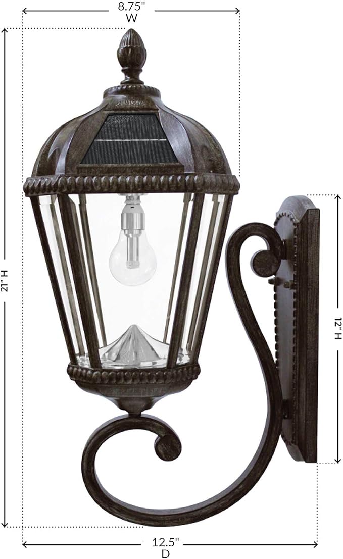 Gama Sonic Solar Outdoor Wall Light, Royal Bulb Exterior Sconce Lamp, Weathered Bronze Finish Aluminum, Rain Water Glass, Warm White LED with Omni-Direction Reflector, 98B310 Upgraded Panel & Battery
