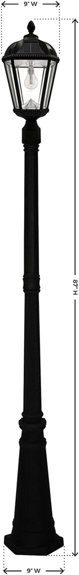 - SIMPLE INSTALLATION - No electrical wiring is required for installation, making this solar lamp post light the perfect light to install while offering an energy and money saving alternative to electric or gas-powered outdoor lighting. Simply place the outdoor solar lamp post light where ample sunshine is available. (Use EZ Anchor GS-3 for in-ground installation- sold separately.) Dimensions: 9 x 9 x 87