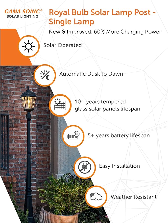 Gama Sonic Solar Outdoor Lamp Post Light, Black Cast Aluminum and Beveled Glass Panels, 10-Year Royal Bulb, Warm White LED with Omni-Direction Reflector, 87-inch Height, 98B001 (Upgraded Panel)