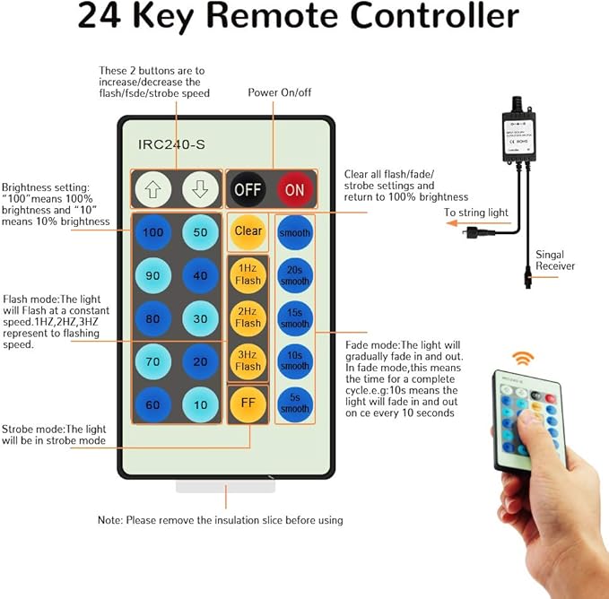 - ☑️REMOTE CONTROL STRING LIGHTS: All modes work via the included 24-key remote control, you can adjust 10-level brightness, 3 options of lighting modes: Flash / Strobe / Fade, and the speed of the dynamic modes, Also the intelligent memory function: the controller box can remember the last mode you set when the power off and on again!