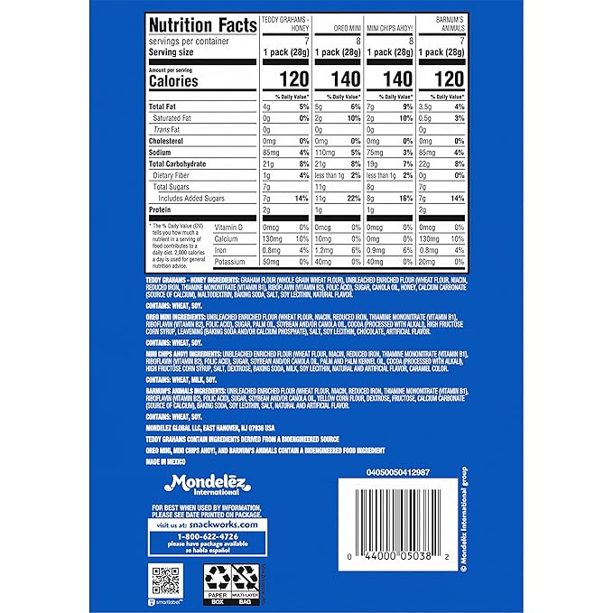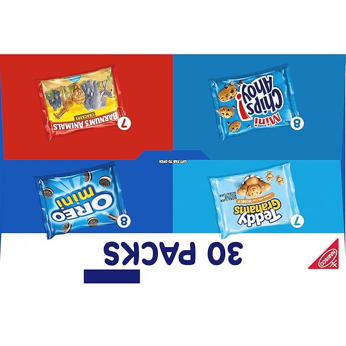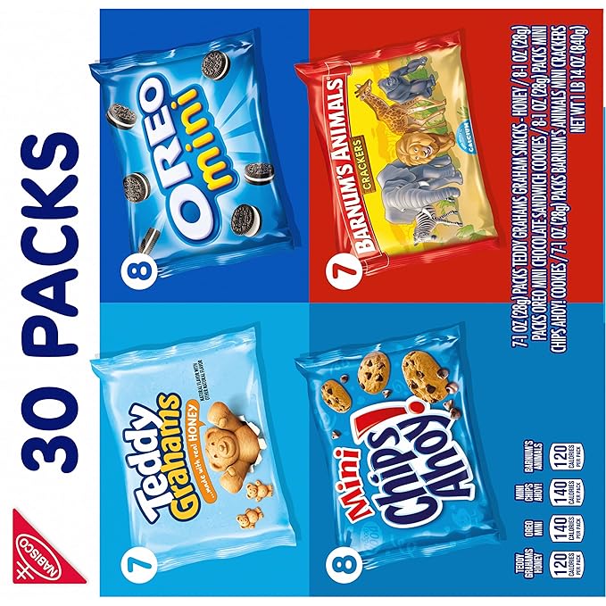 - One 30 count Nabisco Team Favorites Snack Variety Pack, 8 OREO Mini, 8 CHIPS AHOY! Mini, 7 Teddy Grahams, 7 Honey & Barnum's Animal Crackers (packaging may vary)