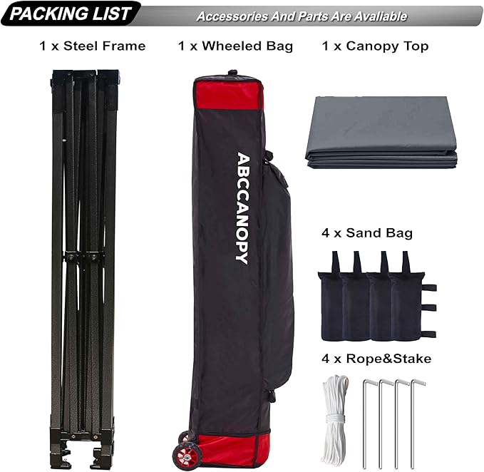 - Set up in second: Super easy to set up with only 2 people. Roller bag for easy portability and light transportation. Heavy duty wheels glide smooth. Bonus 4 Canopy Sand Bags, 4 Stakes&Ropes for stable and sturdy use.