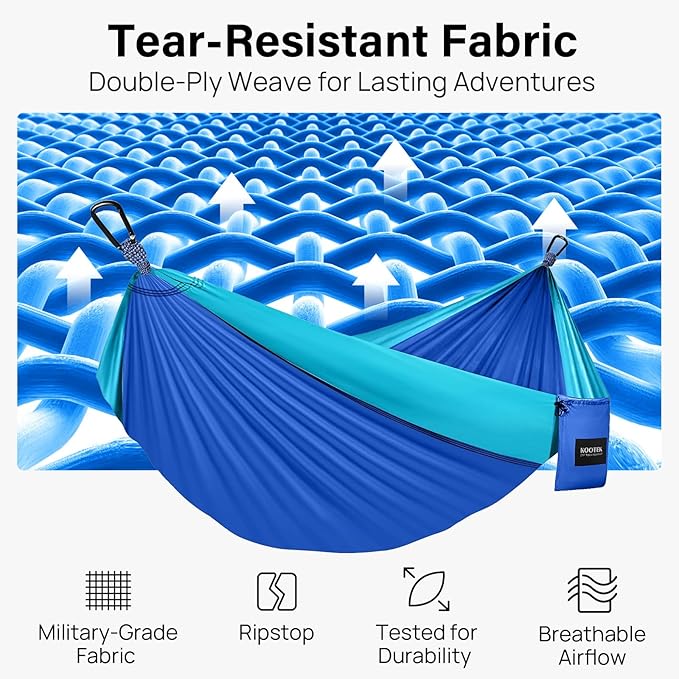 - Sturdy and Premium: Crafted using high-quality 210T parachute nylon material and triple interlocking stitching, our camping hammock provides a soft and comfortable experience while also offering excellent resistance to fraying, tearing, and dirt. Additionally, they are easy to clean and dry quickly, making maintenance a breeze.