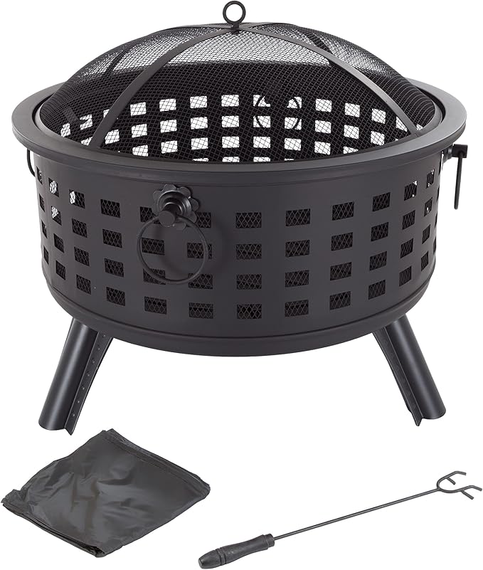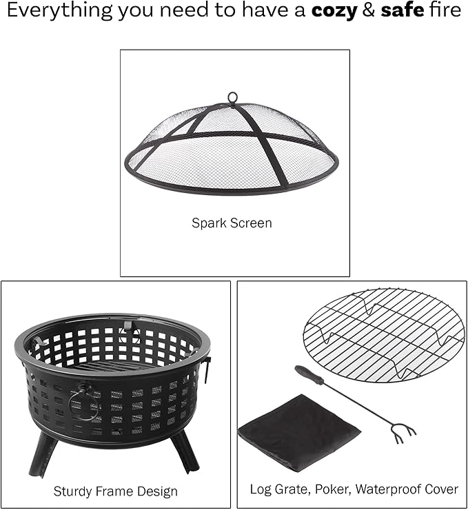 - ACCESSORIES INCLUDED - This 26-inch round fire pit comes with a spark cover, a log grate that allows ashes to drop for larger wood fires, a log poker, and a weather-resistant PVC cover to keep the wood burning fire pit looking great season after season.