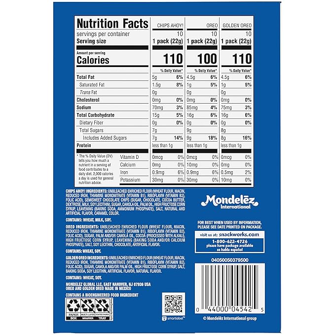 - Full-size OREO cookies and CHIPS AHOY! cookies in convenient snack packs