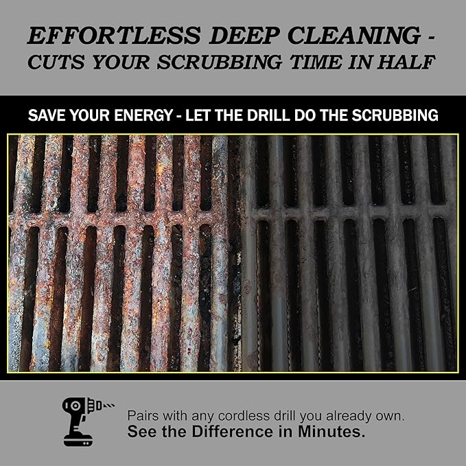 - ENGINEERED TO OUTLAST AND PERFORM: Each drill brush attachment features a rugged, quarter-inch quick-change steel shaft that fits most drills and drivers with ease. Built for demanding tasks, this ultra-stiff scrubber attachment is ideal for blasting away grease, rust, and grime on grills, smokers, ovens, griddles, metal surfaces, brick, and concrete. Add it to your drill set for a tough, no-compromise cleaning solution in the garage, shop, or backyard
