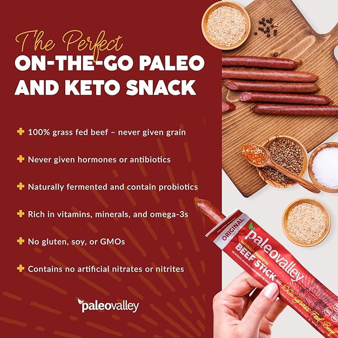- The perfect on-the-go paleo and keto snack: At 6g of protein per serving, Paleovalley’s 100% Grass Fed Beef Sticks will quickly satisfy your cravings without ruining your fitness and health goals.