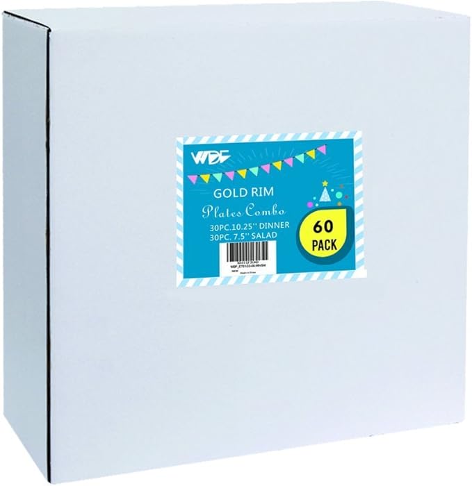 - DURABLE COMBO PACK: 30 x 10.25" dinner plates & 30 x 7.5" Salad/Dessert plates, WDF uses the box to protect white gold plastic plates well ,so don't worry the gold chips off and break easily.