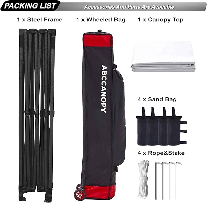- Set up in second: Super easy to set up with only 2 people. Roller bag for easy portability and light transportation. Heavy duty wheels glide smooth. Bonus 4 Canopy Sand Bags, 4 Stakes &Ropes for stable and sturdy use.