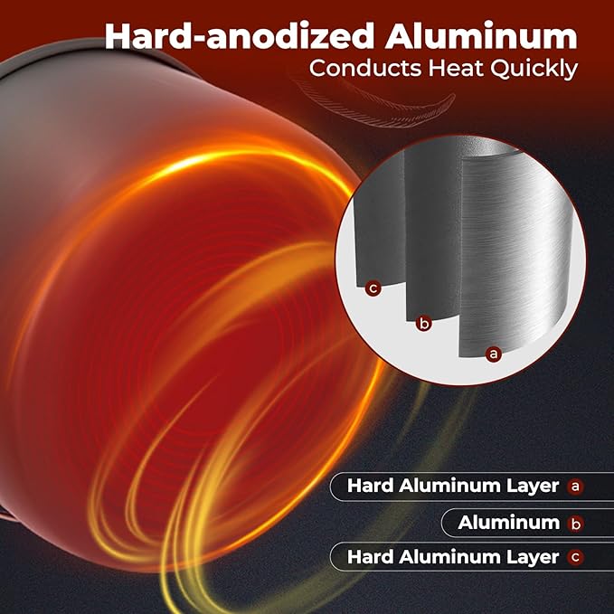 - Food-grade Material: The camping mess kit is made of safe, non-toxic aluminum with non-stick coating for easy cleaning. Hard-anodized aluminum conducts heat quickly, stand high temperature, corrosion-resistant, rust-free, built to last. Heat-resistant handles to keep your fingers safe from the heat. Secure and anti-scald.
