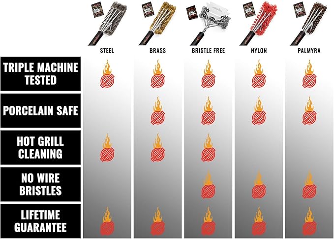 - You Want A Clean Grill Without Having To Worry About Your Family's Safety: We get it. Bristles are great for cleaning your grill, but are a HORRIBLE addition to your deliciously grilled meal. That’s why Grillaholics Essentials Grill Cleaning Brush is built from heavy duty stainless brass and triple machine tested to the highest safety standards. Our brushes are 50% stronger and last 25% longer than other inferior grill brushes.