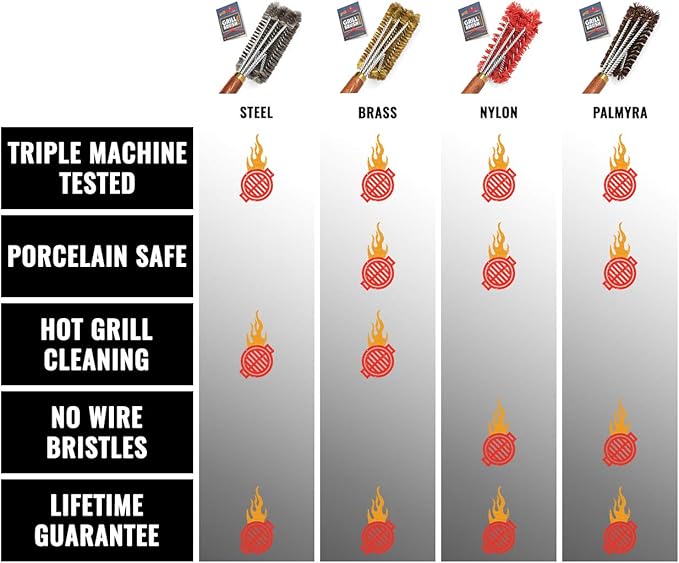 - Not All Grill Brushes Are Safe for All Grill Grates: Recommended for ALL grill types, palmyra bristles are not as sharp and won't scratch porcelain and ceramic grill grates. Own a Char-Broil, Weber, Big Green Egg, Blackstone, gas grills, charcoal, smokers, infrared?…Our premium grill cleaning brush doesn’t discriminate. It’ll scrape burnt-on food off any type or brand of grill with ease!