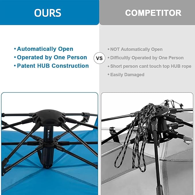 - ☀NEW VERSION OF PATENTED AUTOMATIC OPEN sun shade beach tent on the Market: EXTRA LARGE for your whole family. CLOSED FRONT SIDE give you convenient privacy space. Patent pending HUB mechanic system on the top, which make tent open by itself effortless.