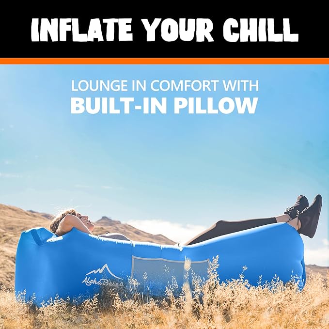 - EASY INFLATION DESIGN -- No pump required for AlphaBeing air lounger. Just a few scoops of air and this inflatable lounger is ready to hangout in. This is a must-have for any BBQ, Pool Party, Beach, Hike, Concert, or Camping Trip. Folding to 12"x 8"x 4"and fitting in its own carrying bag with shoulder strap, this air sofa is ready to be taken anywhere with you.