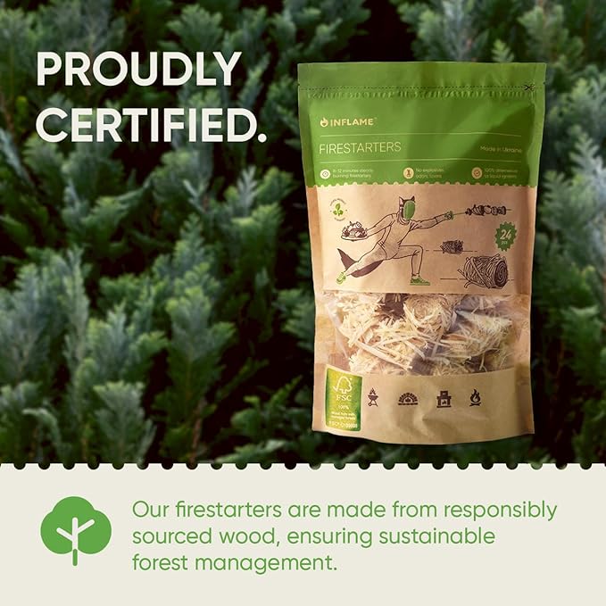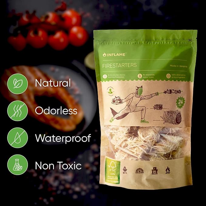 Inflame Fire Starters for Campfires, Grill, BBQ, Fireplace, Woodstove - Charcoal Starter - Waterproof, Weather-Resistant - Natural Wood Fireplace Starters - 24 pcs