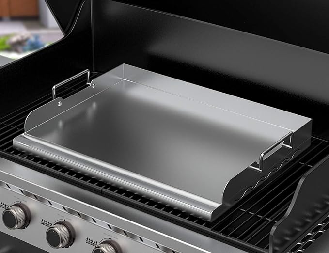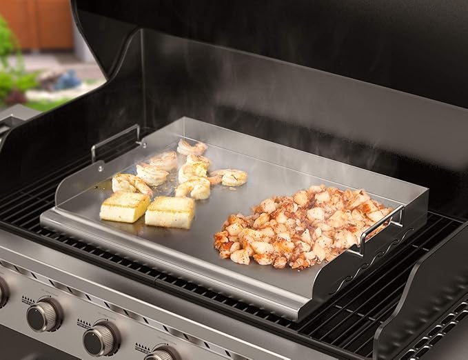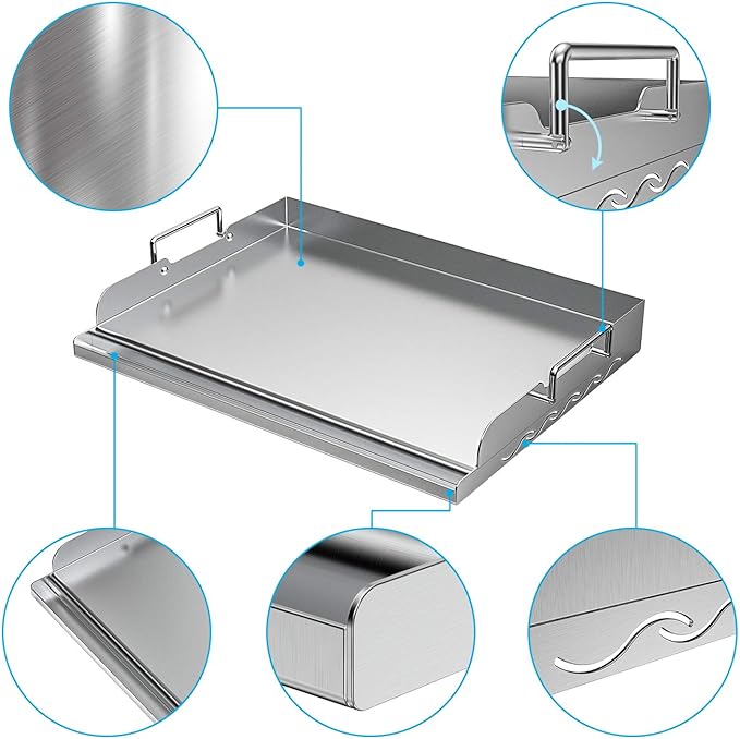 Skyflame Universal Stainless Steel Griddle Flat Top Plate with Even Heating Bracing for BBQ Charcoal/Gas Grills, Camping, Tailgating, and Parties 17" x 13"