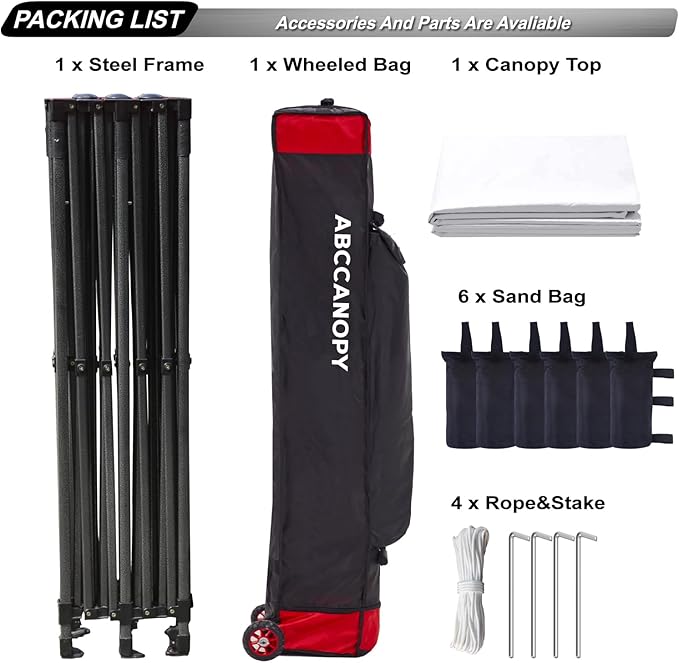 - Set up in second: Super easy to set up with only 2 people. Roller bag for easy portability and light transportation. Heavy duty wheels glide smooth. Bonus 6 Canopy Sand Bags, 4 Stakes &Ropes for stable and sturdy use.