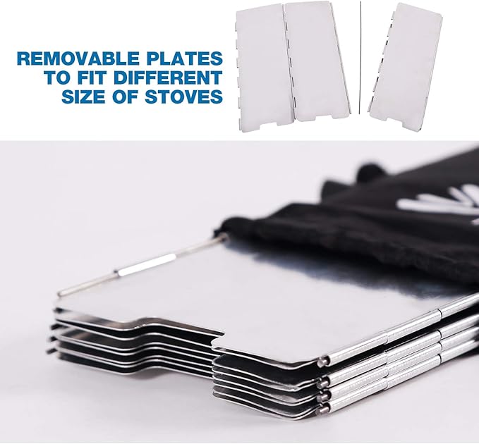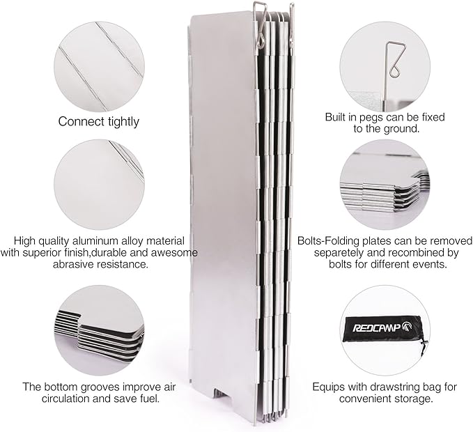 - STURDY: REDCAMP stove windshield has 8 removable plates to fit different size of stove and high quality aluminum alloy material with superior finish, durable and abrasive resistance.