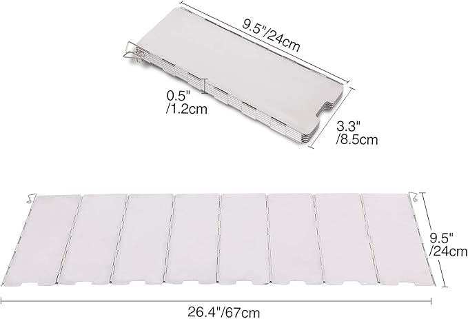 - TALL & LARGE: Folding windscreen camping stove (unfold size)26"x9.5"/66x24cm. (pack size) 9.5"x3.3"x0.5"/24x8.5x1.2cm. Enough to provide wind protection and big enough for both gas backpacking stoves as well as wood burning stoves.