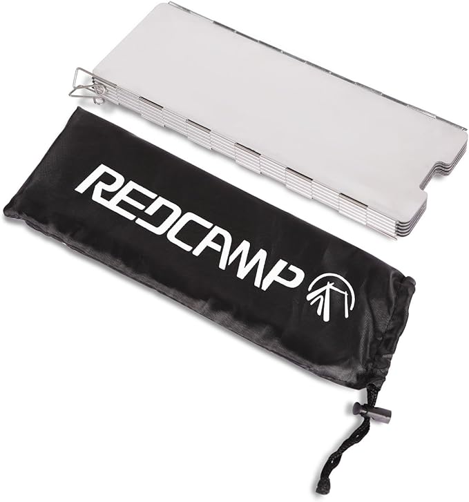 - LIGHTWEIGT & COMPACT: REDCAMP aluminum windscreen has a drawstring bag for convenient storage so that it take up little space. Packing weight of the foldable stove windshield: 0.44lbs (0.2kg).