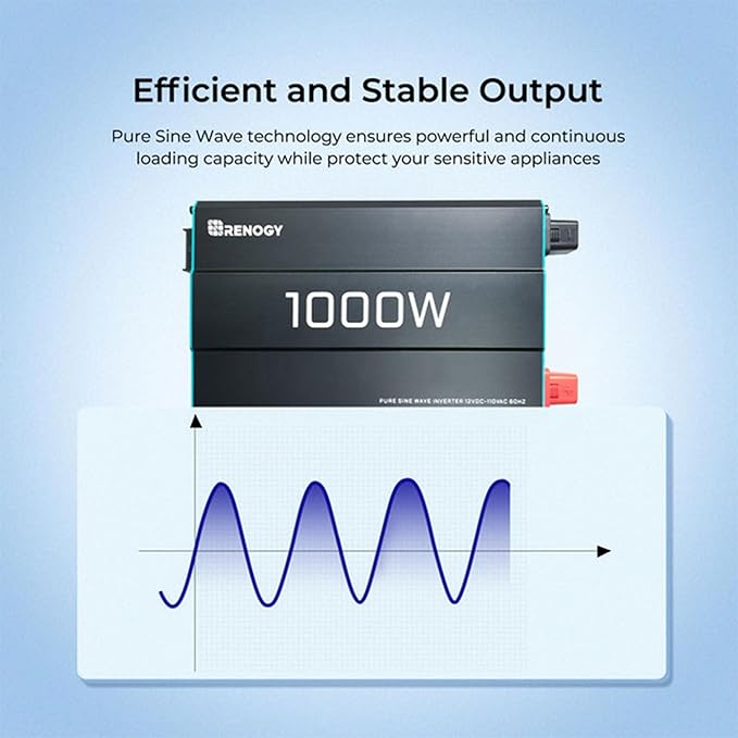 - 【POWERFUL DC-AC】This renogy 1000 watt inverter 12V to 110V provides 1000W continuous DC to AC power, 2000W peak surge during load start-up, 12V to 120VAC pure sine wave with conversion efficiency >90%, reduces conversion loss