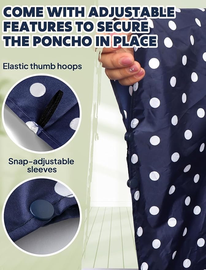 - Fashionable & Well-designed Details: It features an attractive silhouette with nice color. There are 3 pairs of snap closures on each side to create sleeves for ease of movement. Attached an interior "media pocket" to protect electronics. This kind of poncho provides more than enough space for you to wear other clothes even a backpack under it.And it has elastic thumb loops for rainy bike rides that avoid the wind blowing the poncho away
