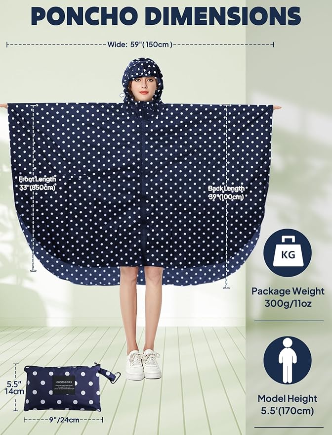 - Easy to Pack: It is quite roomy,comfortable and very well ventilated. There is a useful small circle loop inside the rain poncho that can be hung on the hook after you use it. It will not stain the house or occupy the place.It's a great choice of poncho for daily use and it can be folded up into a compact size for easy storage and transportation. It comes with a carrying pouch to make it easier to bring along on outdoor adventures