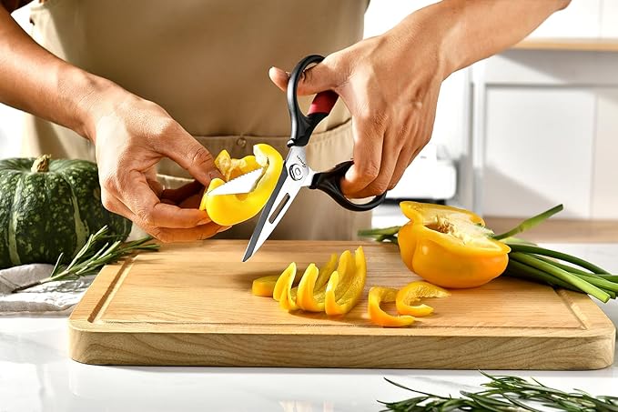 - SHARP BLADES, NO RUST: The micro-serrated blade allows for better gripping of slippery materials. The kitchen shears’ blades are crafted from high-quality, food-grade stainless steel that resists rusting.