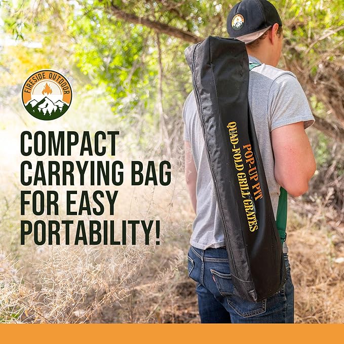 - COMPACT AND EASY TO CARRY FOR CAMPING TRIPS – Our foldable campfire grill grate is lightweight and designed for convenient storage, folding down to 26"x8"x3" with a vinyl bag for transport. This portable fire pit grill complements campfire grill setups, camping grill use, or fire pit outdoor configurations. Whether you’re cooking over a portable firepit or using it as an outdoor cooking grate, it offers simple packing and portability for any outdoor adventure.