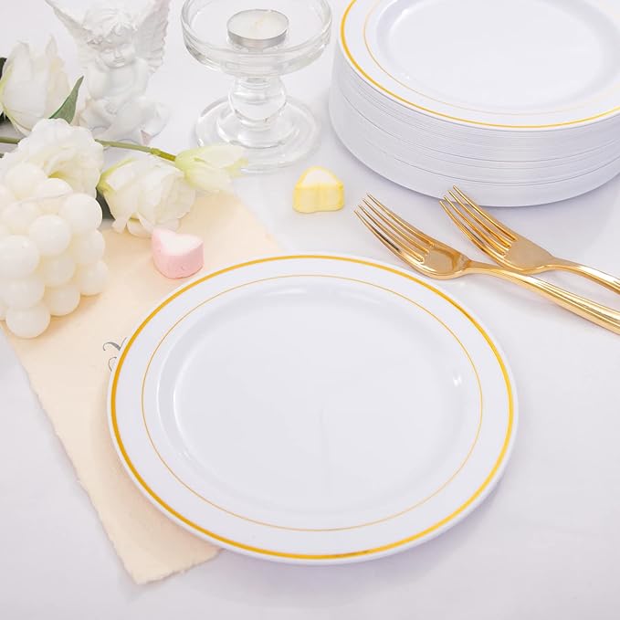- Premium Set of Dinnerware: Our gold trim plastic plates are excellent options that you will get everything you need in this kit - plates (102 7.5inch dessert plates), matching 102 gold forks, which are perfect for events that you need to feel fancy or special.